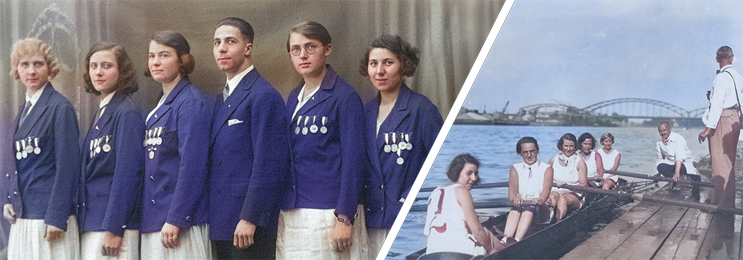 Seit 1930 gingen auch ORV-Frauenmannschaften bei Ruderregatten an den Start.Zuvor wurde nur bei Stil-Ruder-Wettkämpfen teilgenommen. Hier ist die Frauenmannschaft in der Besetzung G. Becker, T. Daus, B. Pfisterer, Gr. Hense, Steuerfrau G. Morr zu sehen, die 1932 bei drei Regatten siegreich waren.