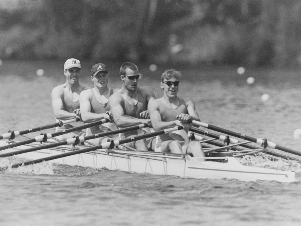 Wolf Bussian, der erfolgreichste ORV-Ruderer überhaupt mit insgesamt 246 Siegen. Links im Bild mit unserem Erfolgs-Trainer Jürgen Jürgensen, oben 1995 mit Robert Sens (RC Kaufering), Johannes Barth (UlmerRC Donau) und Stefan Roehnert (Koblenzer RC Rhenania) auf dem Weg zum Gewinn der Deutschen Meisterschaft im Junior-A-Doppelvierer ohne Steuermann.